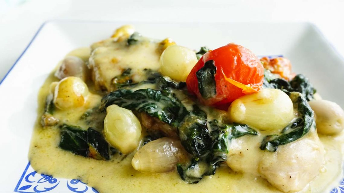 4.Krema, tuz, karabiber ekleyin. Kaynadıktan sonra ocağı kapatıp rendelenmiş kaşarları ekleyerek karıştırın ve fırın tepsisindeki tavukların üzerine yayın.